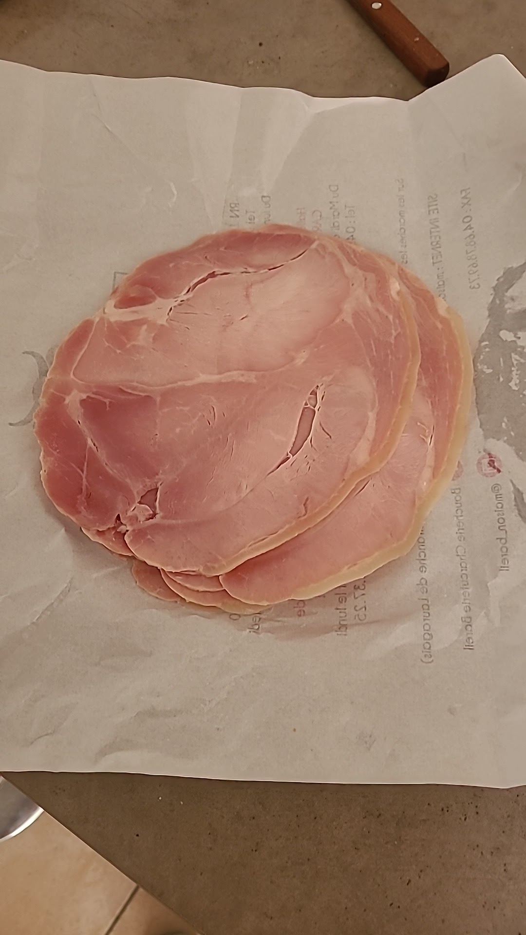 Jambon blanc acheté ce matin en supermarché. Très bon MAIS erreur (ou tromperie) sur le prix au Kg car l'emballage qui pèse 15g est compris. Le prix du poids net n'est donc pas de 16.90€ mais de 18.60€!!! Actuellement et pour une famille nombreuse ce n'est pas rien...